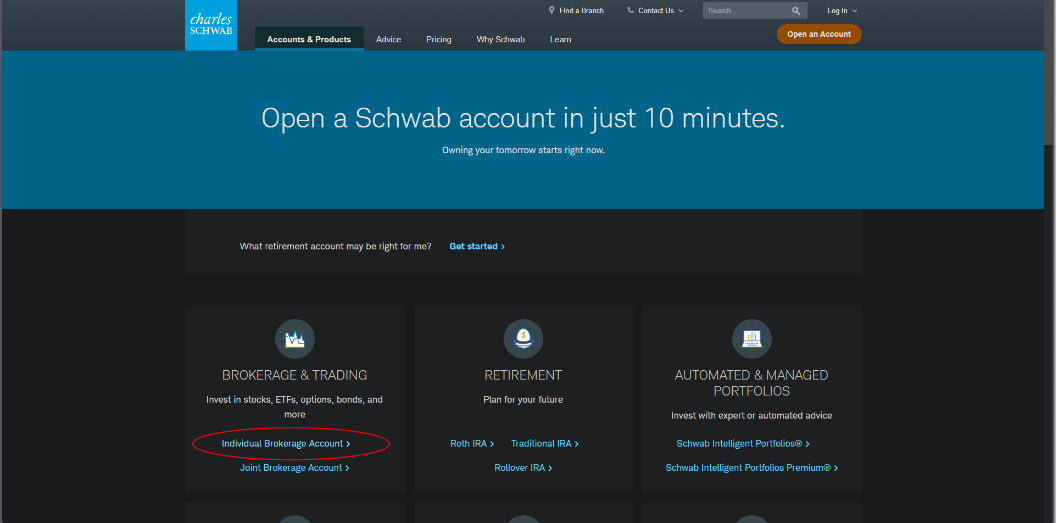 1. Create a new Charles Schwab individual brokerage account at https://www.schwab.com/open-an-account. This account will be your platform to place trades and view your stocks that we will place your initial starting fund into.